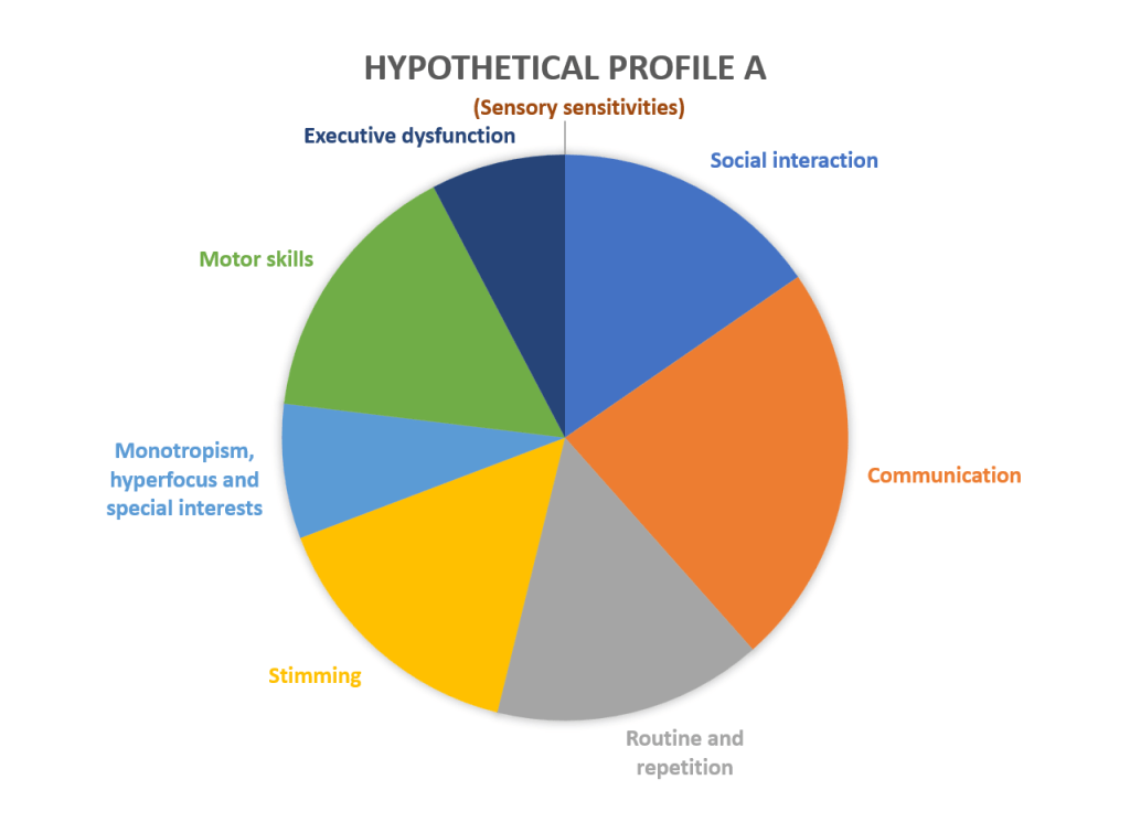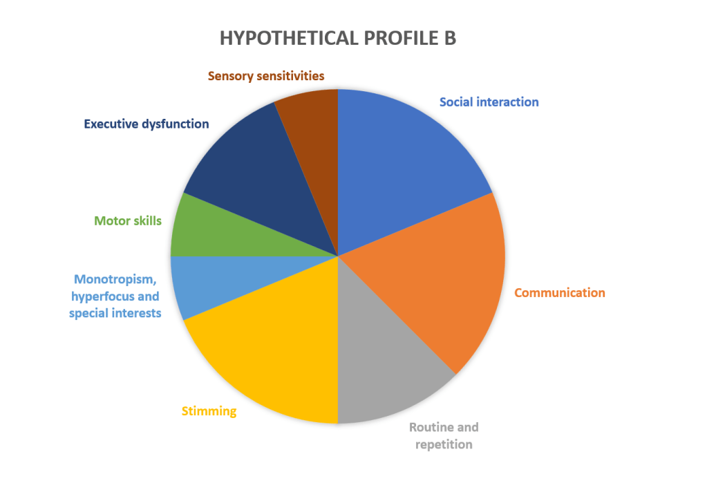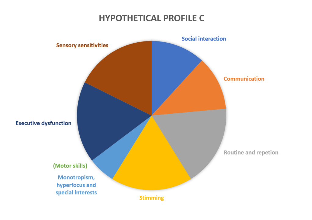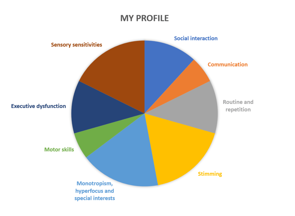 When I think about my own autism profile, I can see that this isn’t the case. I have a higher degree of “sensory sensitivities”, “stimming” and “monotropism, hyperfocus and special interests”, a medium degree of challenges with “social interaction”, “routine and repetition” and “executive dysfunction” and a lower degree of challenges with “communication” and “motor skills”. Is it then correct to define my autism as low? That doesn’t seem very accurate.
