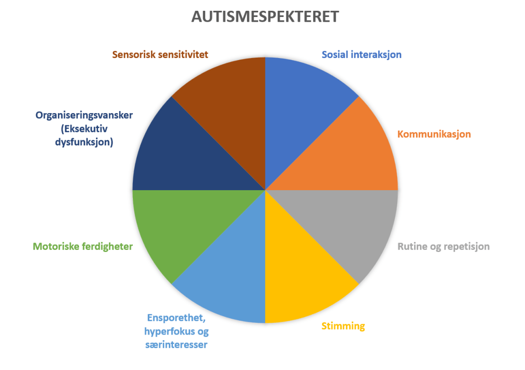 Det finnes mange autistiske trekk og det er derfor mange kategorier som kan inkluderes i spekteret. Her har jeg valgt en versjon med åtte kategorier. Disse er de autistiske fellestrekkene som jeg har delt inn i kategoriene «sosial interaksjon», «kommunikasjon», «rutine og repetisjon», «stimming» og «ensporethet, hyperfokus og særinteresser». I tillegg har jeg valgt å inkludere trekkene «sensorisk sensitivitet», «motoriske ferdigheter» og «organiseringsvansker».