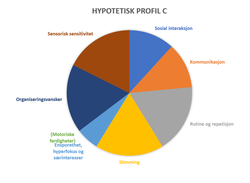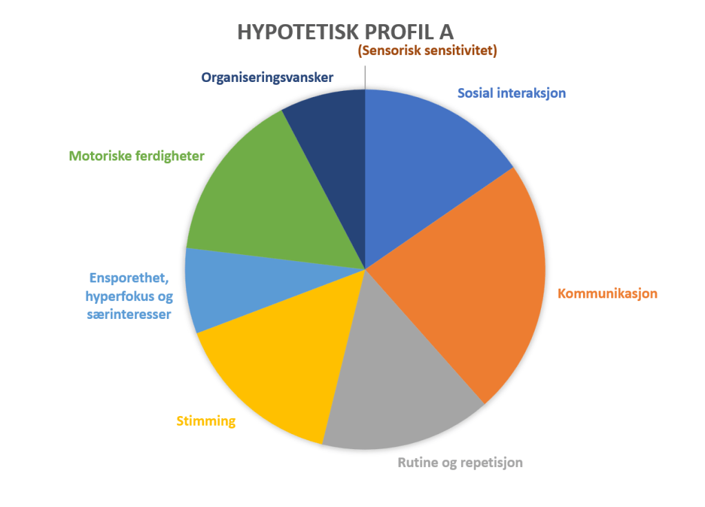 Når jeg tenker over min egen profil, ser jeg at dette ikke stemmer. Jeg har en høyere grad av «sensorisk sensitivitet», «stimming», «ensporethet, hyperfokus og særinteresser», en middels grad av utfordringer med «sosial interaksjon», «rutiner og repetisjon» og «organiseringsvansker», og en lavere grad av utfordringer med «kommunikasjon» og «motoriske ferdigheter». Blir det da riktig å si at jeg har en lav grad av autisme? Det virker ikke slik.