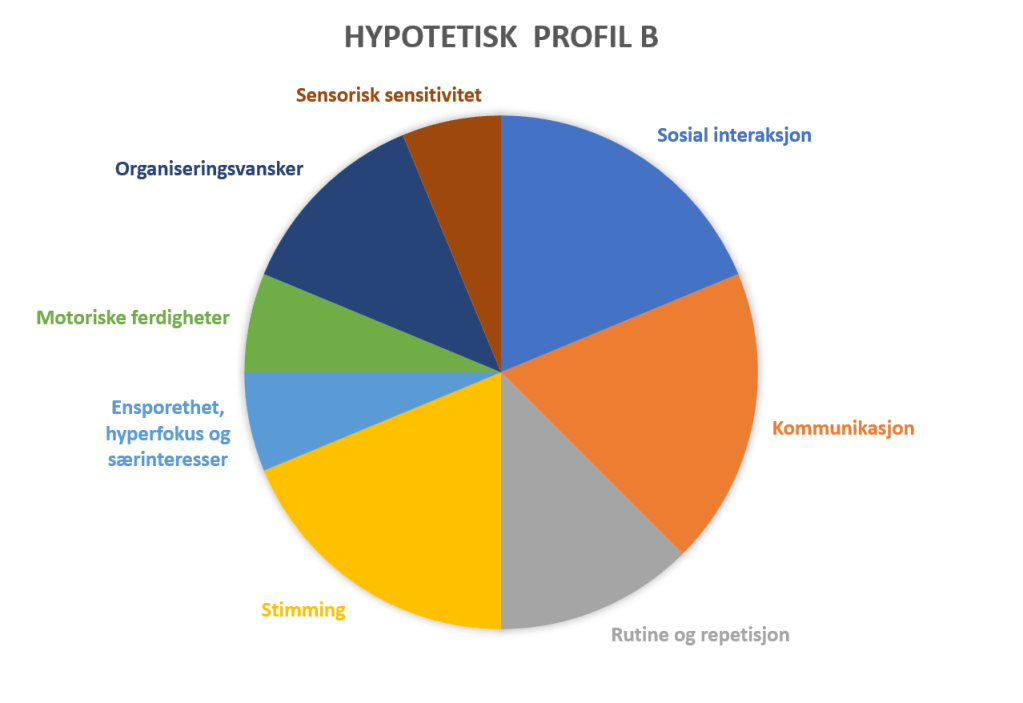 Dette er et eksempel på tre hypotetiske Autister med hver sin unike profil. Ingen av profilene er mer eller mindre autistiske enn de andre. Jo større området i sirkelen er, jo mer har personen av hvert trekk. Hvert trekk kan medføre både styrker og utfordringer.